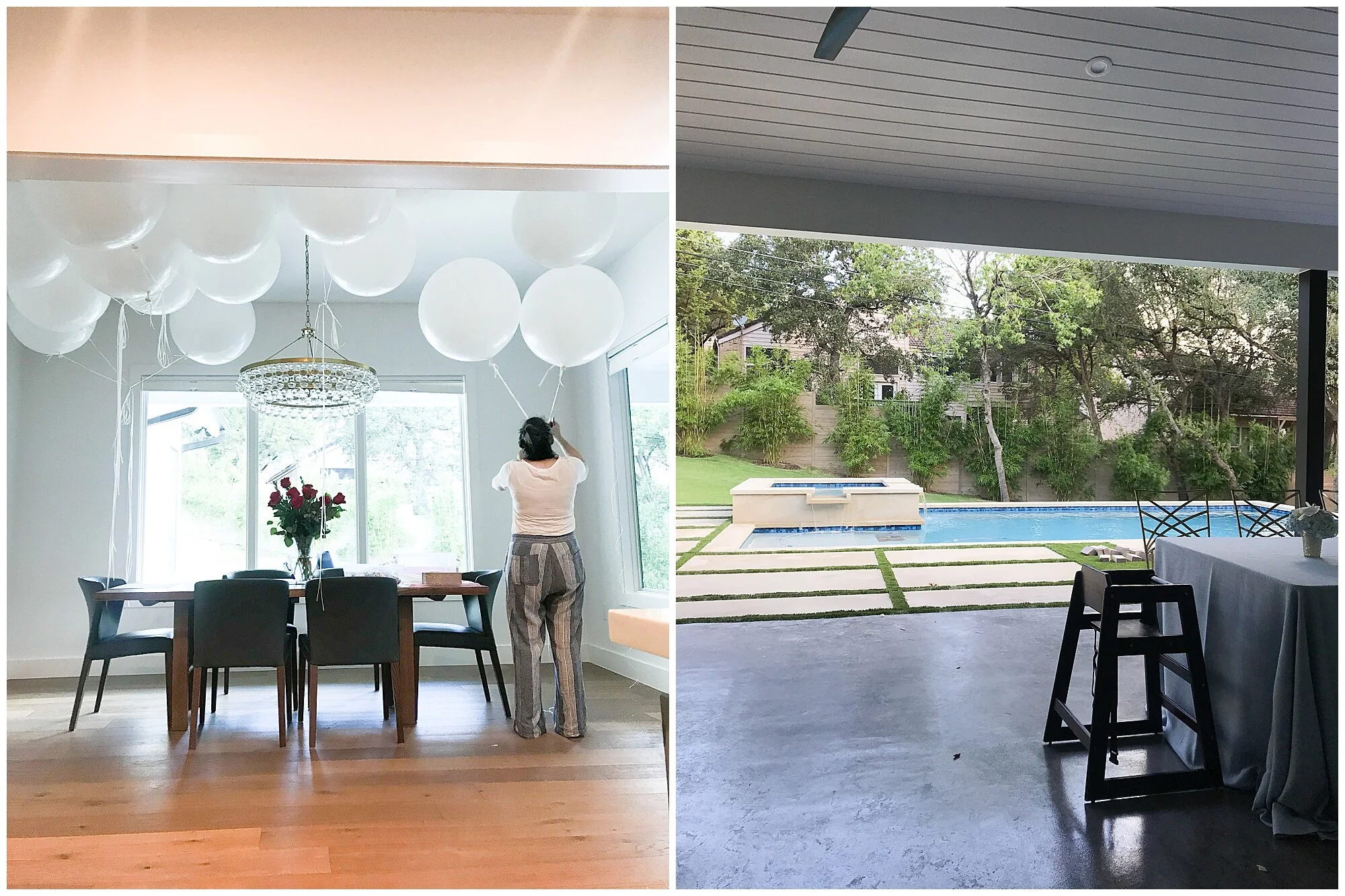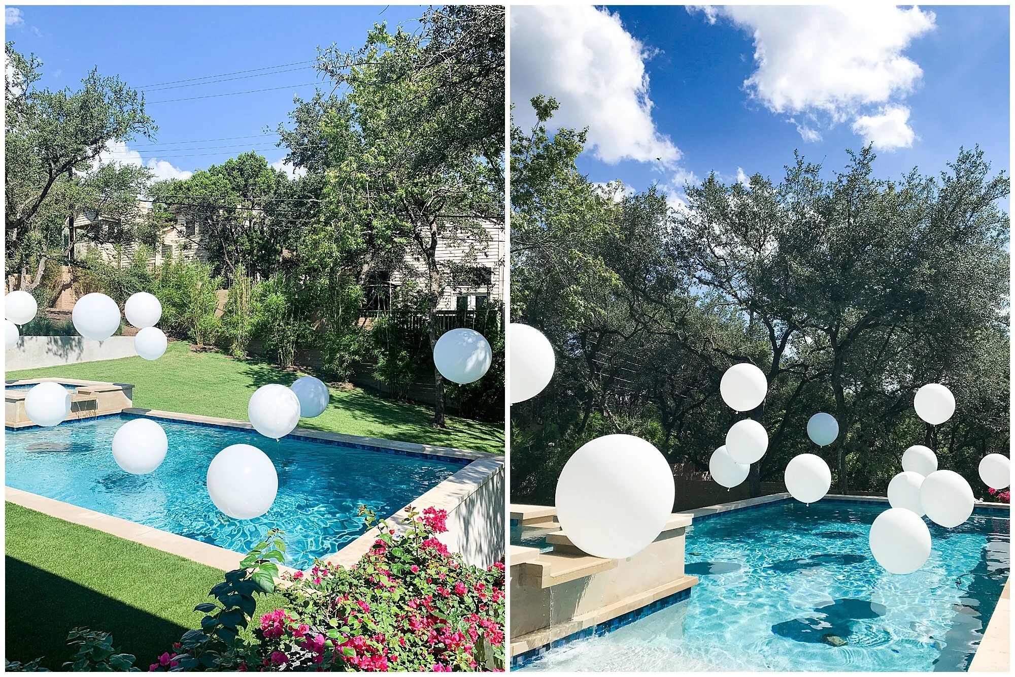 When our client told us they wanted a simple yet whimsical vibe for their backyard reception, we immediately knew which balloon decor to create for their space! We designed the balloons to float at varying heights throughout the pool, creating an image of balloons dancing on water. The orb balloons were the perfect touch without stealing too much attention away from the party!