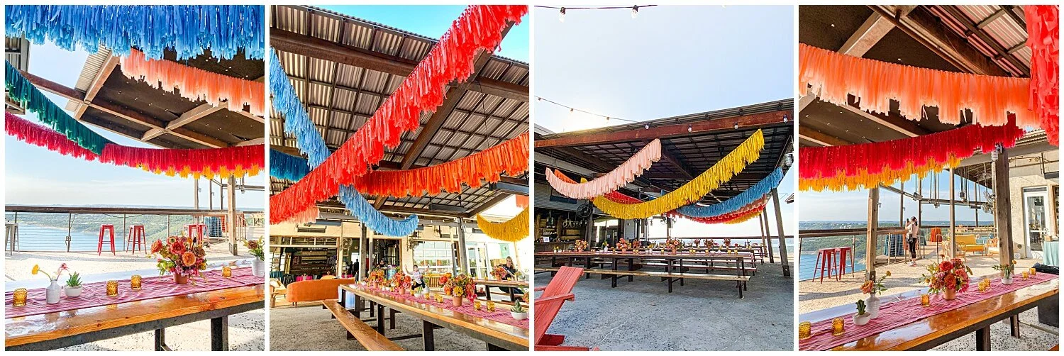 We connected with Vanna soon after to chat about the vision she and Megan had for the day, and what ideas we thought would work for the space at Oasis Texas Brewing Company. They had several goals: create a festive and colorful space, decorate with something unique that would wow guests (enter: streamer fringe!), and work with a local Austin-based company as opposed to having someone travel in.